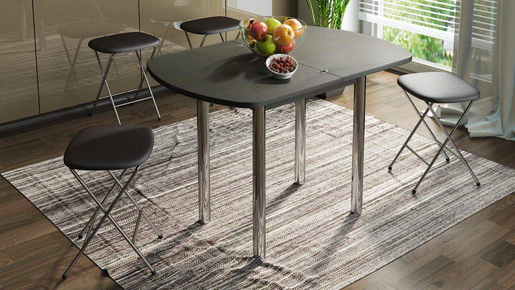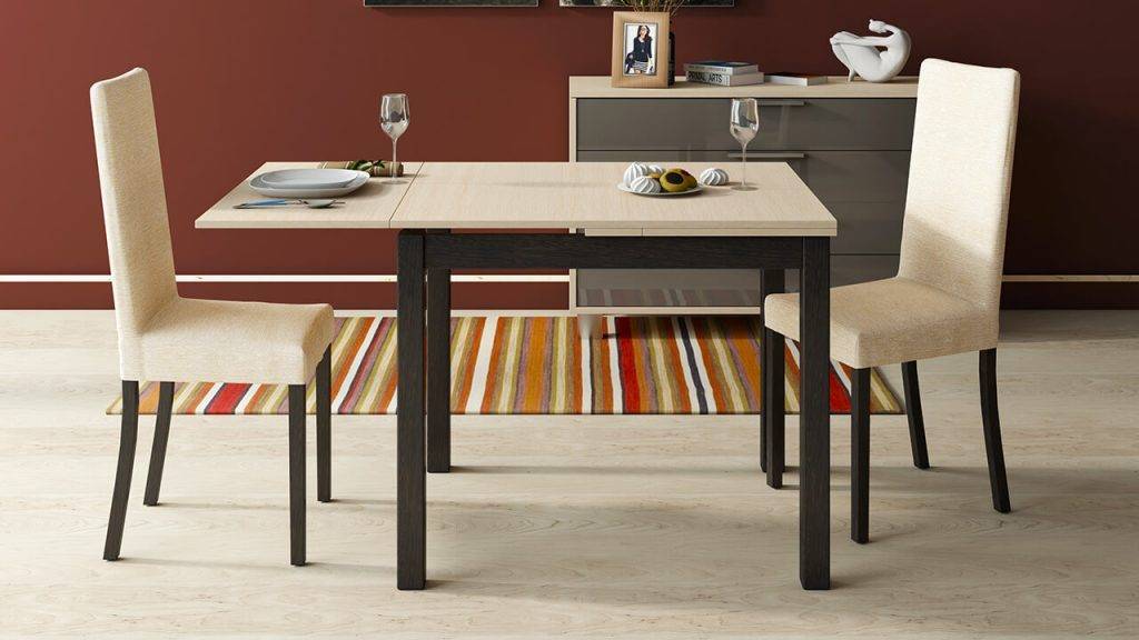 - раскладные столы состоят из трех элементов. Центральный прямоугольник неподвижен, а два боковых «крыла» полукруглой формы можно произвольно опускать или поднимать. В сложенном виде это небольшой прямоугольный стол, который двумя движениями можно превратить в просторную круглую столешницу;