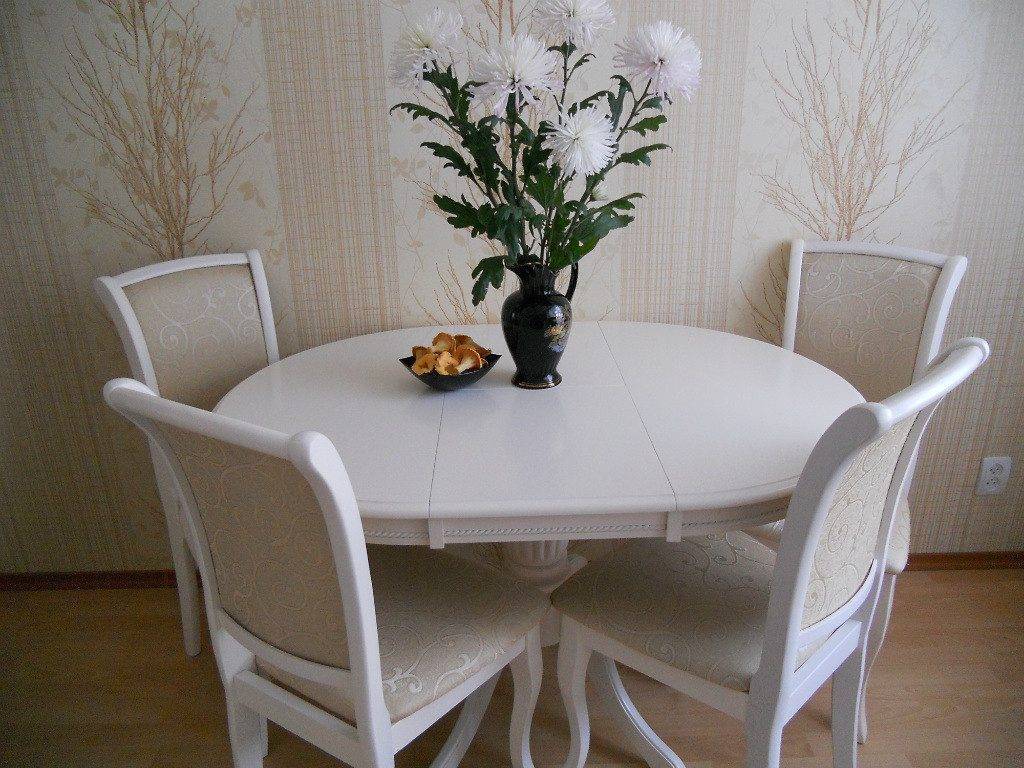 Белоснежный стол с круглой столешницей с деревянными стульями