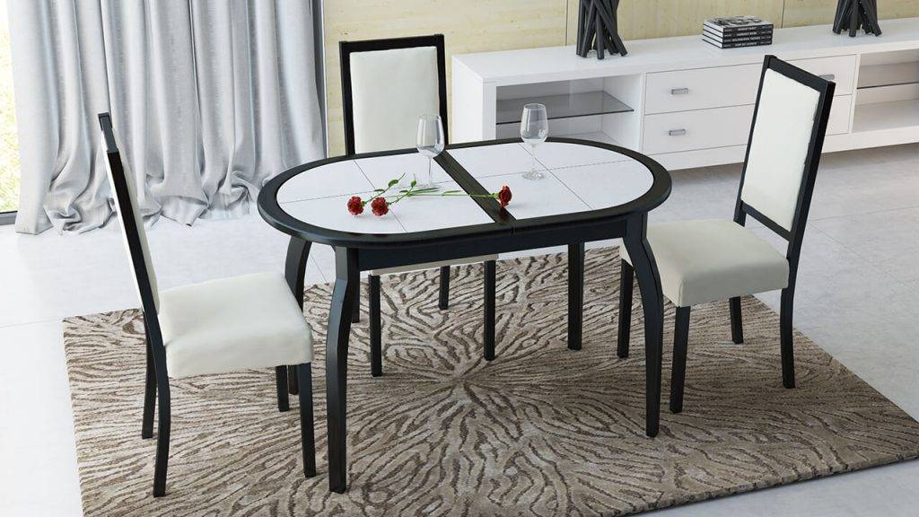 - столы-вкладыши состоят из двух частей в форме полукруга и двух прямоугольников, спрятанных внутри конструкции. Для того, чтобы разложить стол, половинки раздвигают. Два дополнительных элемента поднимают и устанавливают в центральной части, после чего полукруги сдвигают, состыковывая пазы. Получается овальная столешница, которая больше исходной на треть;