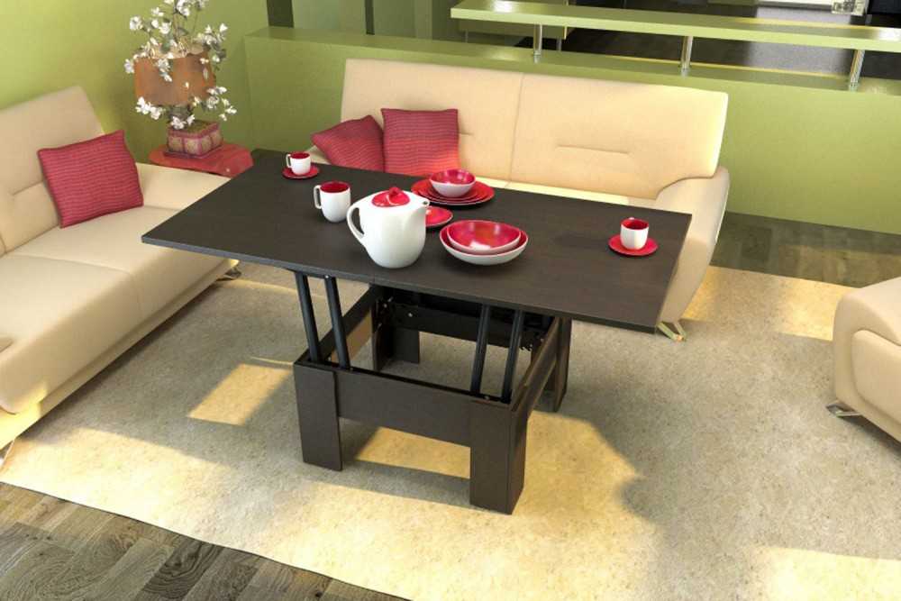 Распространен вариант стола-книжки — имея поднимающиеся пластины и раздвижные опоры, увеличивающие площадь столешницы в два-три раза, он легко может обеспечить места для семьи и гостей. Но в сложенном виде изделие не занимает большой площади и может располагаться у стены. Внутри часто делается отделение для хранения вещей. Дизайнерские варианты столов-трансформеров могут отличаться оригинальной формой и конструкцией, необычными дополнительными элементами, но обычно стоят достаточно дорого и являются частью общего проекта декора помещения.