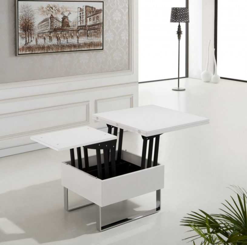 Интересные конструкторские и дизайн решения предлагаются для журнальных столов-трансформеров, которые из низкого куба могут превратиться в стандартный обеденный стол. Такое превращение происходит за счет раздвижного и фиксирующего механизма: столешница используется в выпрямленном состоянии для стола и может превращаться в куб, притом крестообразно закрепленные ножки на шарнирах складываются внутри, выступая в виде стильного декора.