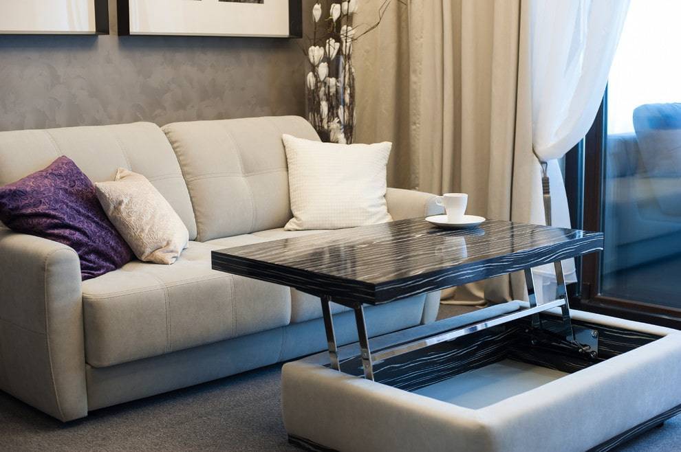 Столы-трансформеры в гостиную имеют специальные механизмы, встроенные в конструкцию из различных материалов. Это позволяет их подбирать под любой дизайн помещения. Производители изготавливают данный вид мебели из различных материалов.