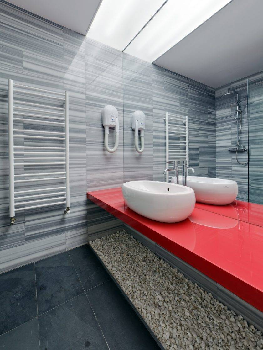 Столешница с двумя раковинами в дизайне ванной комнаты, оформленной в стиле минимализм