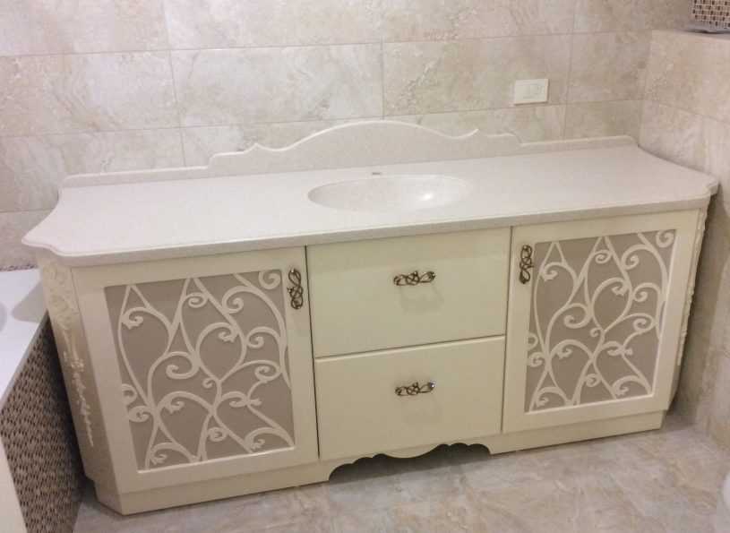 Если вы не хотите останавливаться на типичной тумбе под раковину, то ваш верный выбор – столешница. Кроме привлекательно дизайна, она может помочь неплохо сэкономить – изделие из недорогого материала обойдется даже дешевле, чем конвейерная мебель.