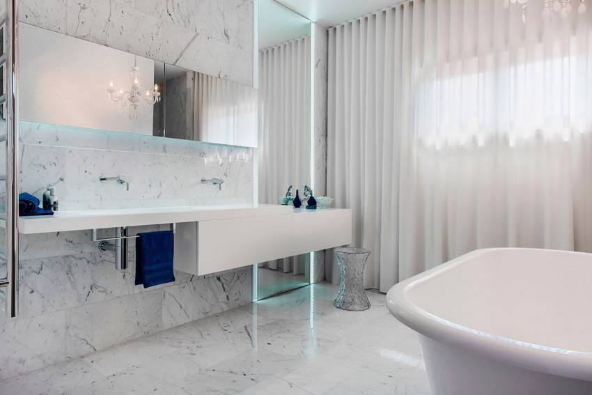 Столешницы из натурального камня. Мраморная столешница для ванной комнаты станет ее настоящим украшением, мрамор придает любому помещению роскошь и шик. Сочетать натуральный камень можно практически с любыми другими материалами. В ванной камень смотрится гармонично со стеклом, керамическими, зеркальными, хромированными поверхностями. Столешница может иметь любой цвет, быть контрастного оттенка или близкого к остальным поверхностям в ванной. Изготавливают ее из цельного камня, вырезая при этом отверстие для раковины.