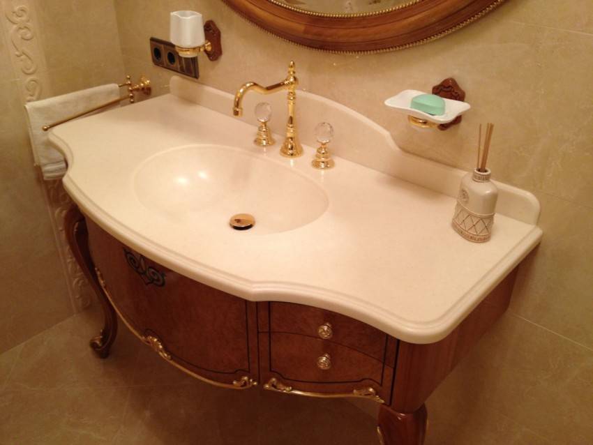 Дизайн столешницы должен гармонично сочетаться с интерьером. Например, для ванной комнаты, выполненной в классическом стиле, подходят прямоугольные или овальные модели из мрамора или гранита. Если хочется сэкономить, то можно приобрести столешницу из искусственного камня.
