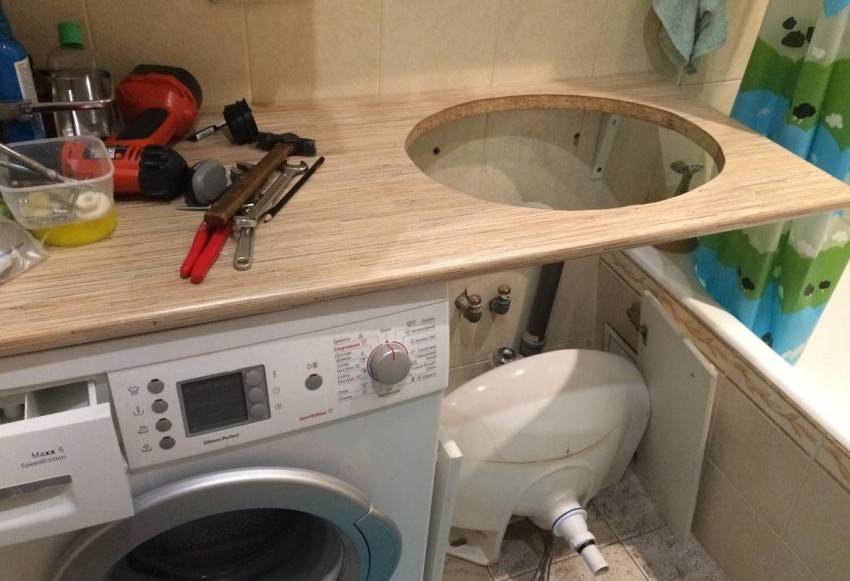 Установка такой конструкции считается сложной, так как столешницу приходится резать, инструментом, выбор которого зависит напрямую от ее материала.