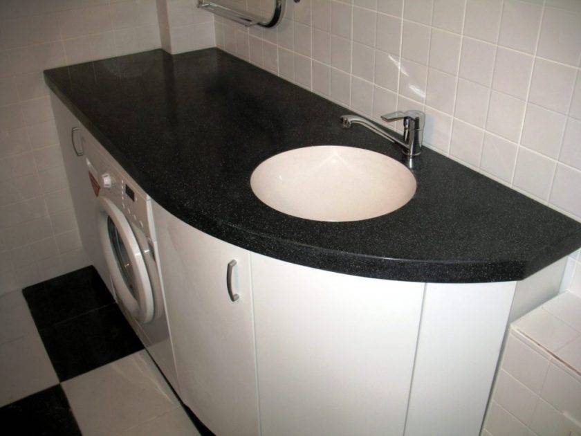 В ванных комнатах с малой площадью под небольшую цельнолитую столешницу очень удобно устанавливать стиральную машину.