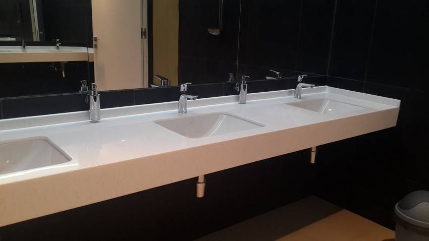 Работать с кварцевым агломератом очень просто, из него можно делать неровные столешницы с плавными переходами или плоскостями разных уровней, можно сделать бесшовный стык с другими материалами и раковиной. Акриловые столешницы для ванной комнаты очень легкие, просто монтируются, устойчивы к повреждениям, при должном уходе прослужат много лет. Главное достоинство акриловой столешницы – в ее цене, которая в несколько раз ниже, чем натуральный материал.