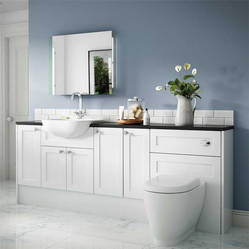 Очень удобное и практичное решение: установка конструкции под рукомойник и стиральную машину. Подойдут такие варианты, как: цельнолитая модель, на опоре с тумбой или же со встроенными шкафчиками под умывальником.