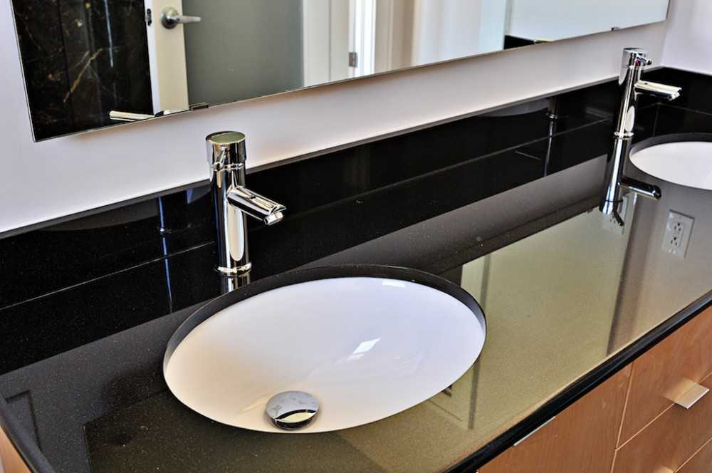 Перед установкой нужно проверить, нет ли дефектов. Столешница должна плотно прилегать к основанию, лежать ровно и не раскачиваться. Раковина в каменную столешницу ставится с помощью специальных металлических элементов