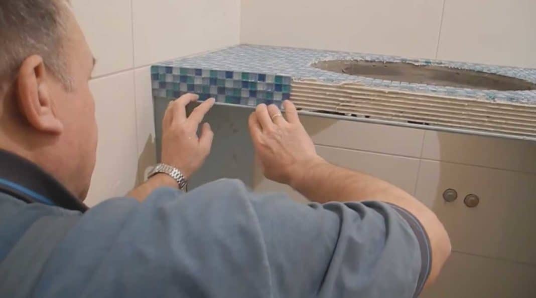- Облицовывают торцы. Работу выполняют стандартным способом. Для заделки швов между плитками используют влагостойкую затирку. Монтаж раковины производят после высыхания клея, нижние края чаши обрабатывают силиконовым герметиком.