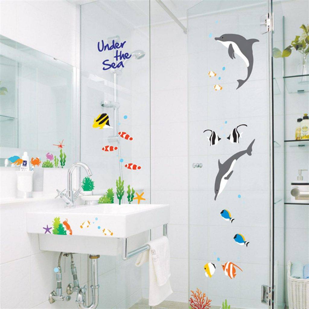 Пластиковые материалы отлично сочетаются с любыми молекулярными клеями, поэтому в магазине можно приобрести самую простую штору. Вариантов декорирования очень много – это и аппликации, и декупаж, фреска и мозаика. В случае с аппликацией на плотно наклеиваются различные пластиковые элементы в виде цветов, животных, абстрактных изображений.