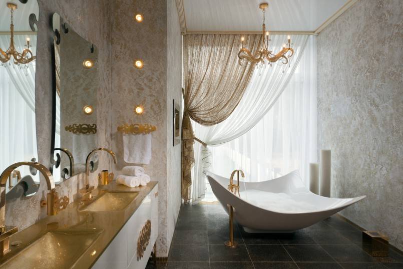 Разнообразить интерьер ванной позволят шторы с интересными деталями. Это могут быть завязки контрастного цвета, окантовка, драпировки