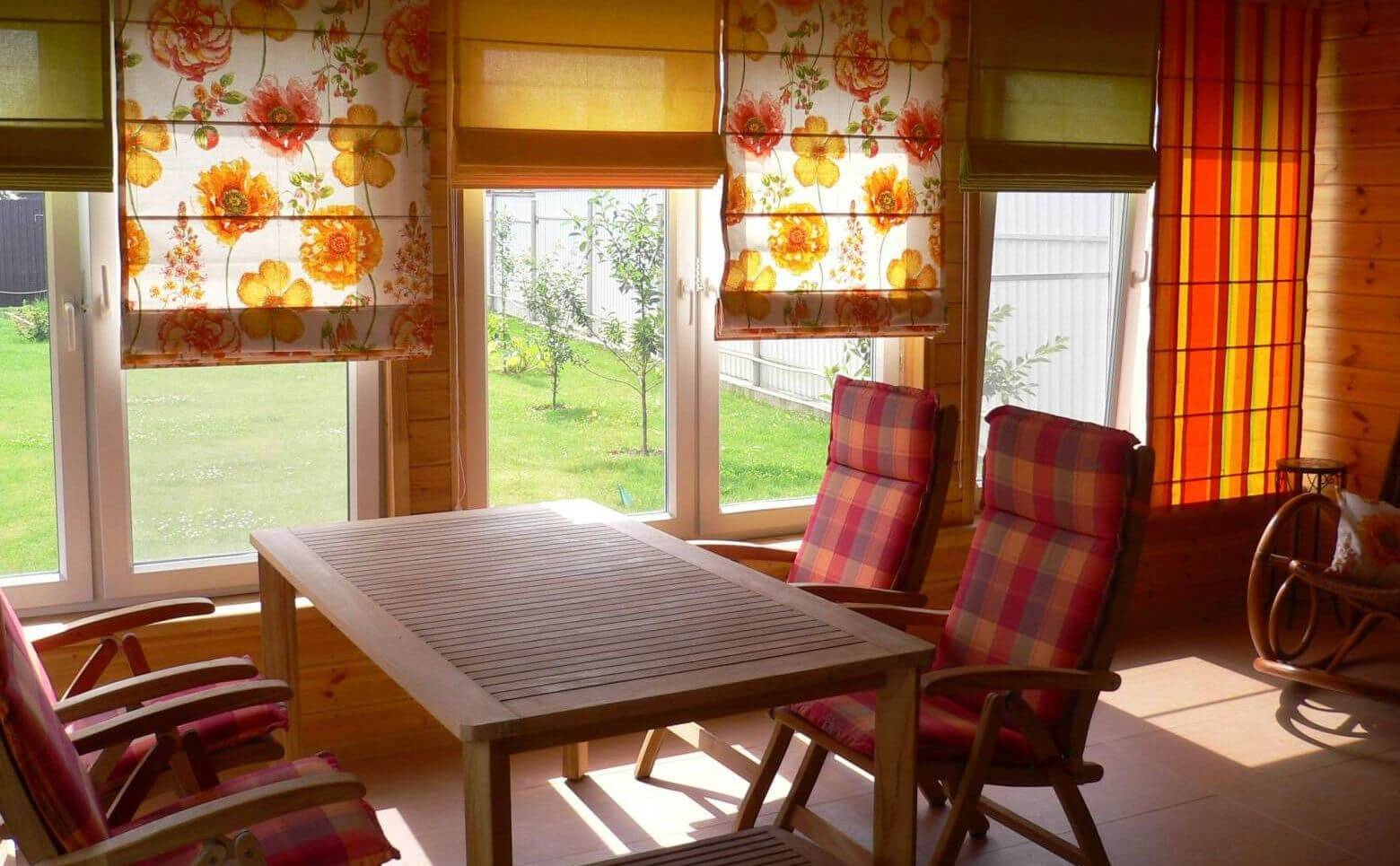Яркие и разноцветные римские занавески при помощи простого механизма складываются в аккуратные складки. Когда необходимо, плотно закрывают окна террасы и защищают ее от солнечных лучей