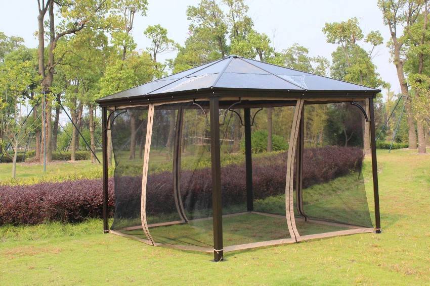 Большим минусом можно считать то, что панели однозначно уменьшат обзорность беседки. К тому же зачастую придется заказывать нестандартный проект с особыми размерами. Стоит отметить, что выбрать цвет панелей будет трудно, так как в стандартном варианте они всегда белые. Это повлечет за собой увеличение объема работ и повышение цены.