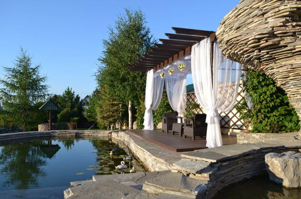 Нежные складки, образовываемые такой тканью, мягко обрамляют проемы беседки и придают прекрасный вид строению.