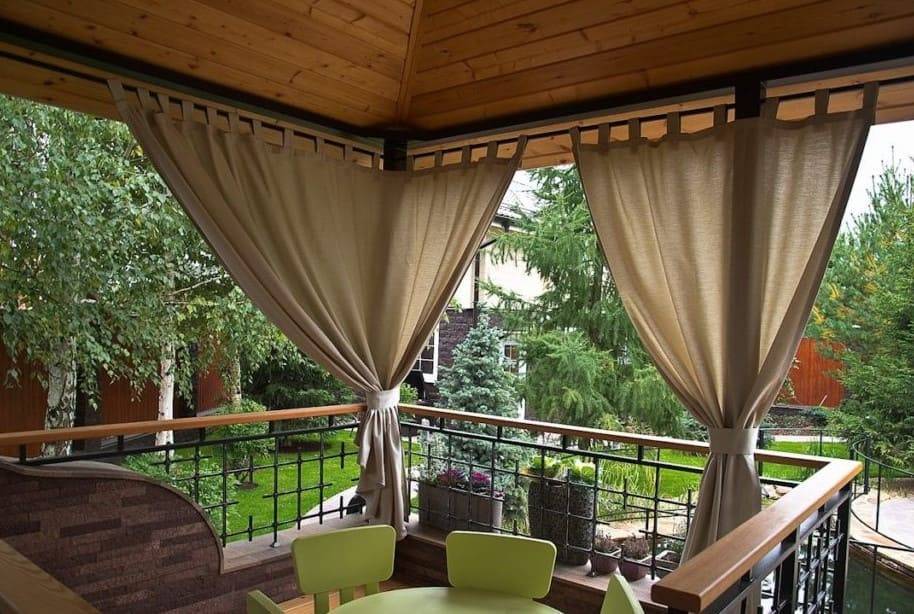 Плотные занавески для летней беседки способны защитить отдыхающих от насекомых и порывов ветра