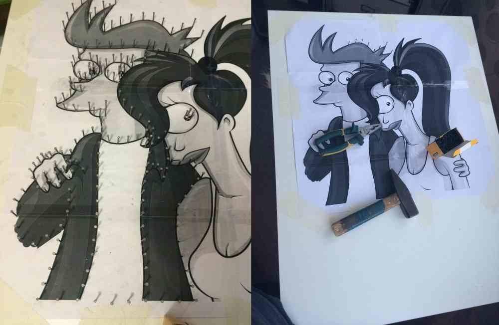 Натяните всю нитку, а затем закрепите её. На этой фотографии можно увидеть весь процесс создания силуэтной картины из самых простых гвоздей и ниток и увидеть саму получившуюся работу: