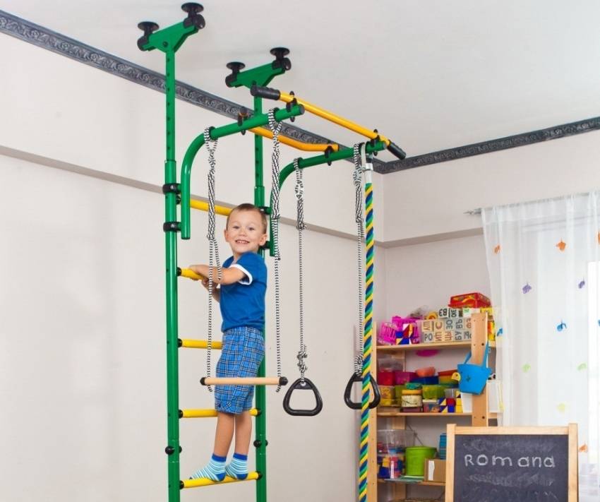 В состав конструкции входит лестница длиной от потолка до пола, в верхней части которой установлен турник. Возле стенки могут крепиться спортивные снаряды (брусья, кольца, веревочная лестница, канат, боксерская груша и пр.). Наиболее экономичный вариант – это рамка с поперечными перекладинами.