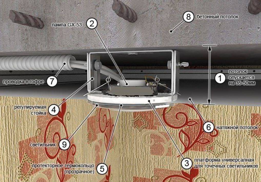 Монтируя споты нужно учитывать материал натяжного потолка, материал из которого сделан каркас. Если есть возможность возгорания, тогда: