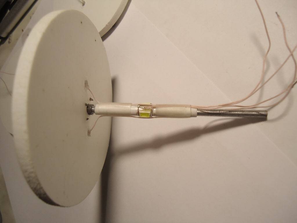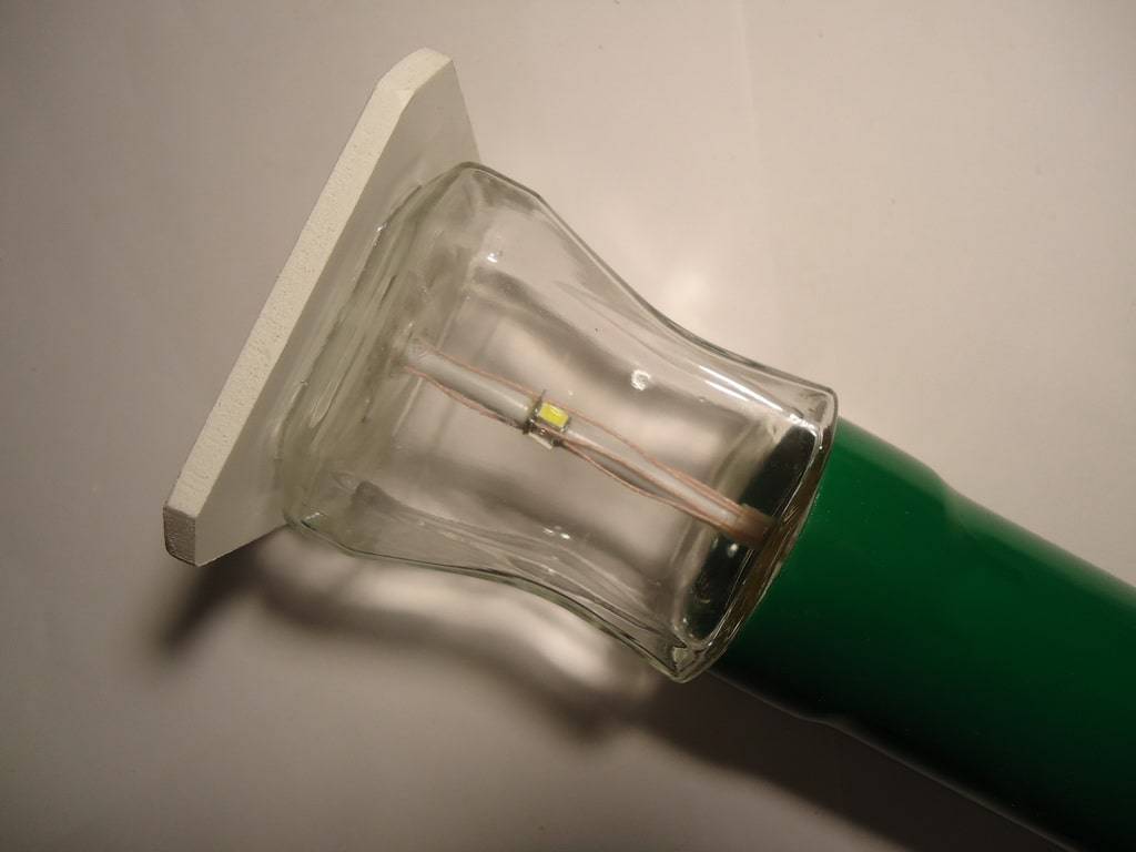Стойка крепится к нижней части плафона. Способ соединения зависит от того, из чего у вас плафон и какая стойка. Если у плафона зауженное горлышко, то можно сделать наплыв пластиковой трубки, которая используется в качестве стойки. Кстати, полость в такой ножке хорошо подойдёт для размещения электроники.