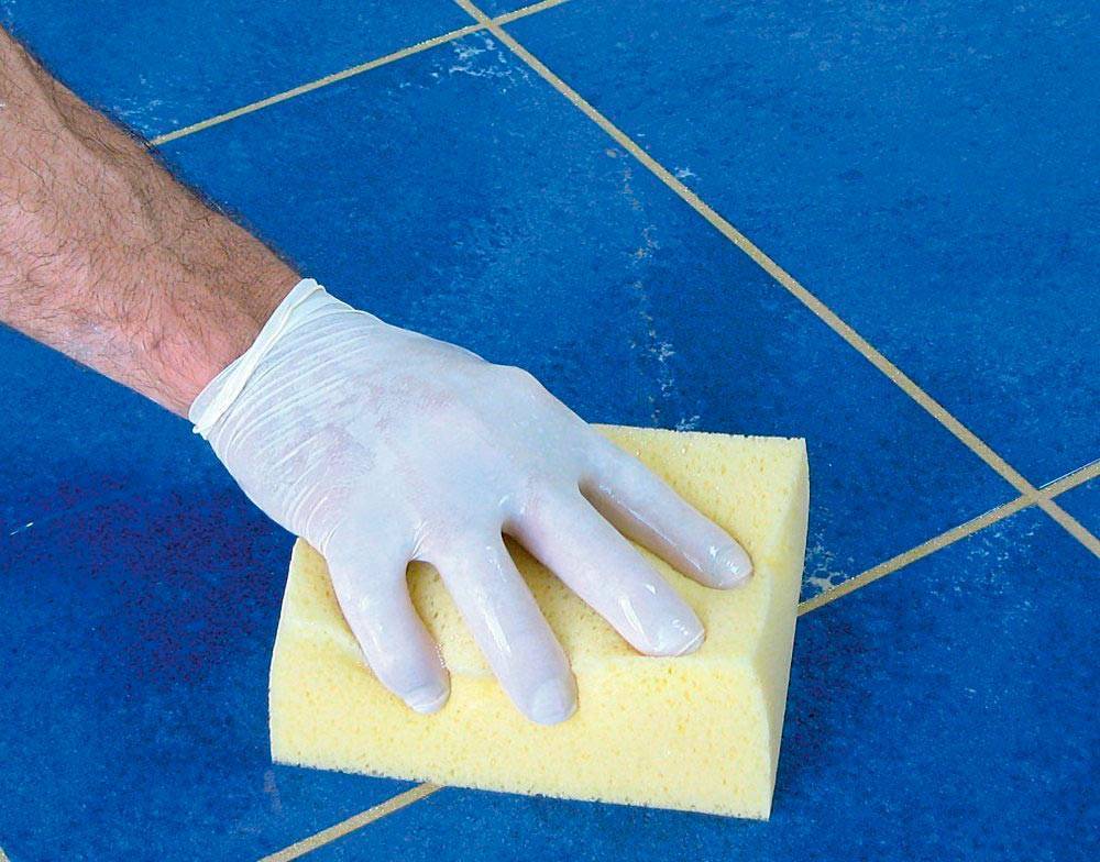 - Через 15-20 минут удалить остатки смеси с плитки влажной губкой.