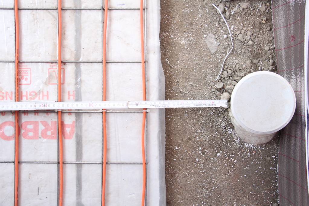 Как и в случае с водяным контуром, сначала нужно стелить утеплитель. Можно использовать материалы с фольгированным покрытием, которые будут отражать тепло от основания. Также крепят специальные профиля, по которым будет фиксироваться электрический кабель. Между его петлями максимально допустимое расстояние составляет 30 см, при его соблюдении получается равномерный прогрев. Поверх закрепленного кабеля заливается стяжка, монтируется подкладка.