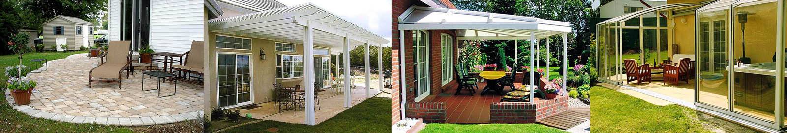 Преимущество грунтоприлежащей террасы – меньший объем земляных работ и возможность настелить настил из дерева или современных специальных материалов для террас, см. далее. Недостатки – плохое проветривание под настилом и серьезные технические трудности в постройке кровли; выполнить грунтоприлежащую террасу закрытой и тем более обитаемой практически невозможно. Поэтому грунтоприлежащие террасы, отдаленные от дома, от непогоды укрываются зонтами или временными навесами, а прилегающие к дому маркизами или навесами, укрепленными на основном строении, см. рис.: