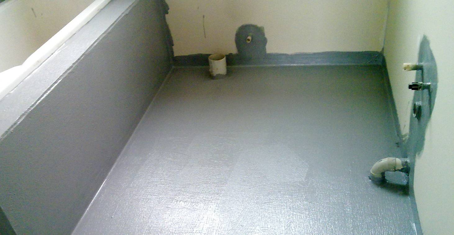 Можно использовать также гидроизоляционные мастики, которые наносят в 2–3 слоя кистью или валиком на основание, захватывая 10–15 см участка стены. В комплексе с мастикой часто используют рулонный материал, Это позволяет создать прочное «корыто» в котором будет уложено деревянное покрытие.