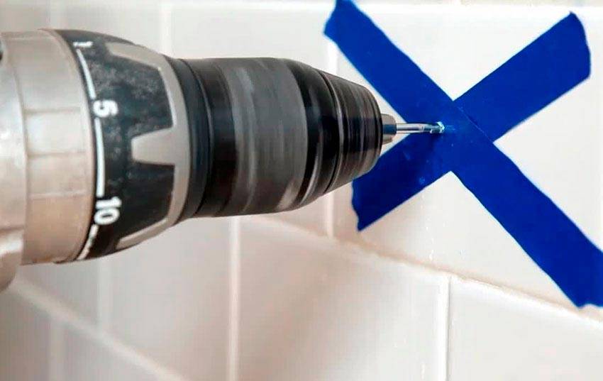 - На поверхность кафеля, непосредственно на месте сверления, нужно наклеить малярную ленту либо обыкновенный пластырь. Это необходимо для того, чтобы предотвратить скольжение сверла по поверхности кафеля.
