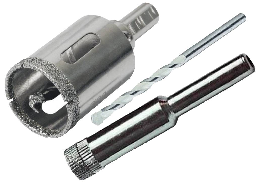Довольно часто требуется выполнить сверление кафеля, чтобы получить в нем отверстие большого диаметра, предназначенное для монтажа труб и электрических розеток. Такое отверстие в кафеле может иметь диаметр от 10 до 70 мм. В этом случае лучше всего использовать сверла корончатого типа, на рабочую часть которых нанесено алмазное напыление. Инструмент с центровочным сверлом можно применять в комплекте с ручной электрической дрелью, а без него – только при помощи стационарного сверлильного оборудования.