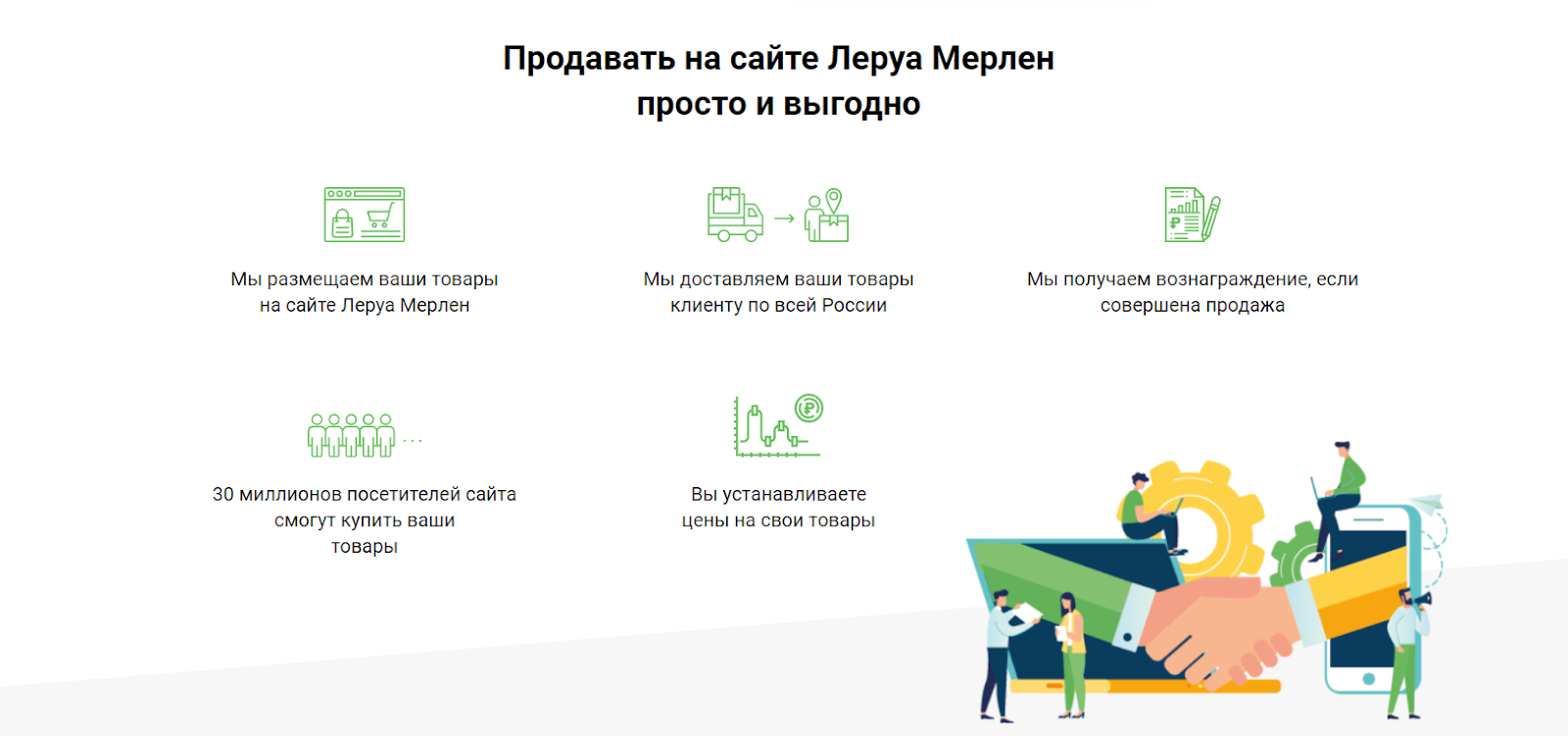 Торговая площадка предлагает партнерам не просто площадку для продаж, но и полный комплекс услуг: логистику, обучение персонала, техническую поддержку. Маркетплейс самостоятельно размещает товары на сайте и доставляет заказы по всей России, а партнер получает доход за каждую совершенную сделку. «Леруа Мерлен» позволяет поставщикам самостоятельно назначать цены на продукцию и предлагать к реализации разные типы товаров – от сантехники до отделочных материалов.