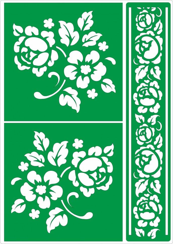 Трафареты сложные составляют несколько приспособлений. Главный орнамент нанесен на основной шаблон. На другом вырезаны детали. Наносят их поверх первого орнамента. В комплекте два и более приспособления, размеры их любые. Многоцветный рисунок сочетает светотени, блики, текстуру разных оттенков.