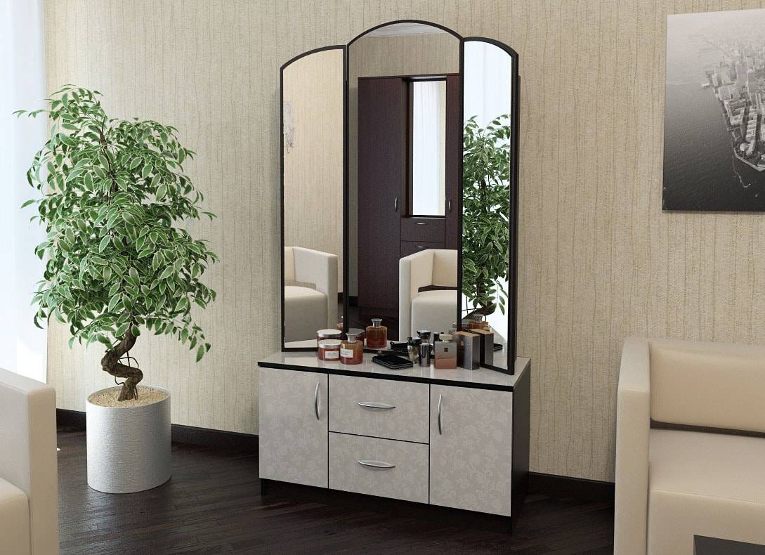 габариты – обычно это довольно высокое и широкое зеркало, вместительная тумбочка, а также необходимость в дополнительном свободном пространстве перед трельяжем, чтобы осмотреть себя в полный рост.