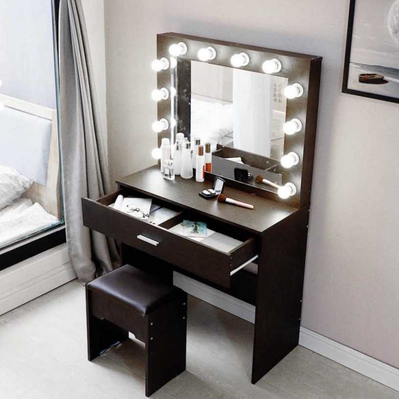 - Из традиционного трюмо можно сделать туалетный столик. Помните, что туалетному столику требуется хорошее освещение. Светильники следует располагать симметрично, чтобы убрать тень с лица. Хорошо подойдут поворотные лампы на кронштейнах.