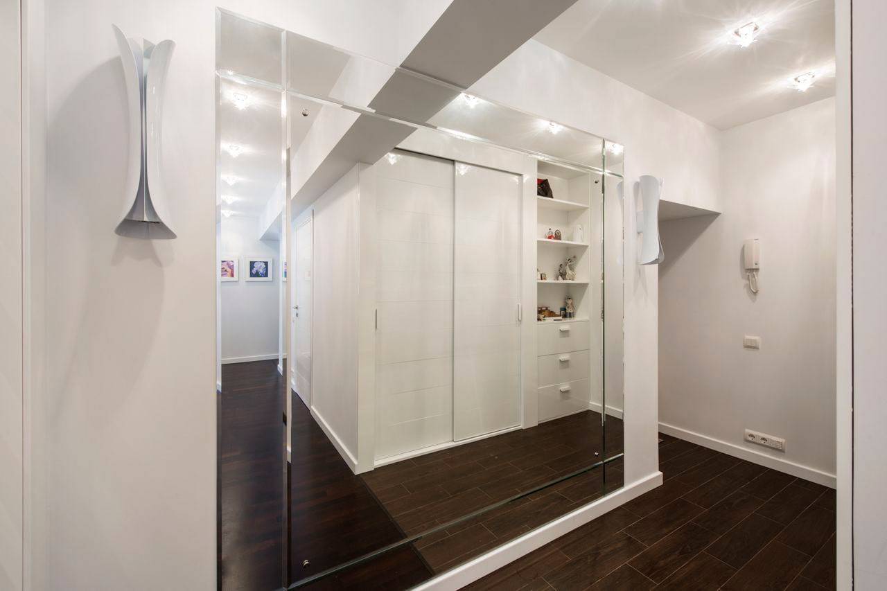 Весьма необычный вариант – сделать зеркальную отделку в прихожей. Благодаря этому визуально пространство будет казаться больше. Кроме того, это действительно удобно, так как можно будет посмотреть на себя в полный рост. Чаще всего представленное решение выбирают для узких и длинных прихожих. Но учитывайте, что за такой поверхностью придется постоянно и очень часто ухаживать. В противном случае прихожая будет выглядеть неряшливо. А столь красивая отделка и вовсе потеряет всю привлекательность.