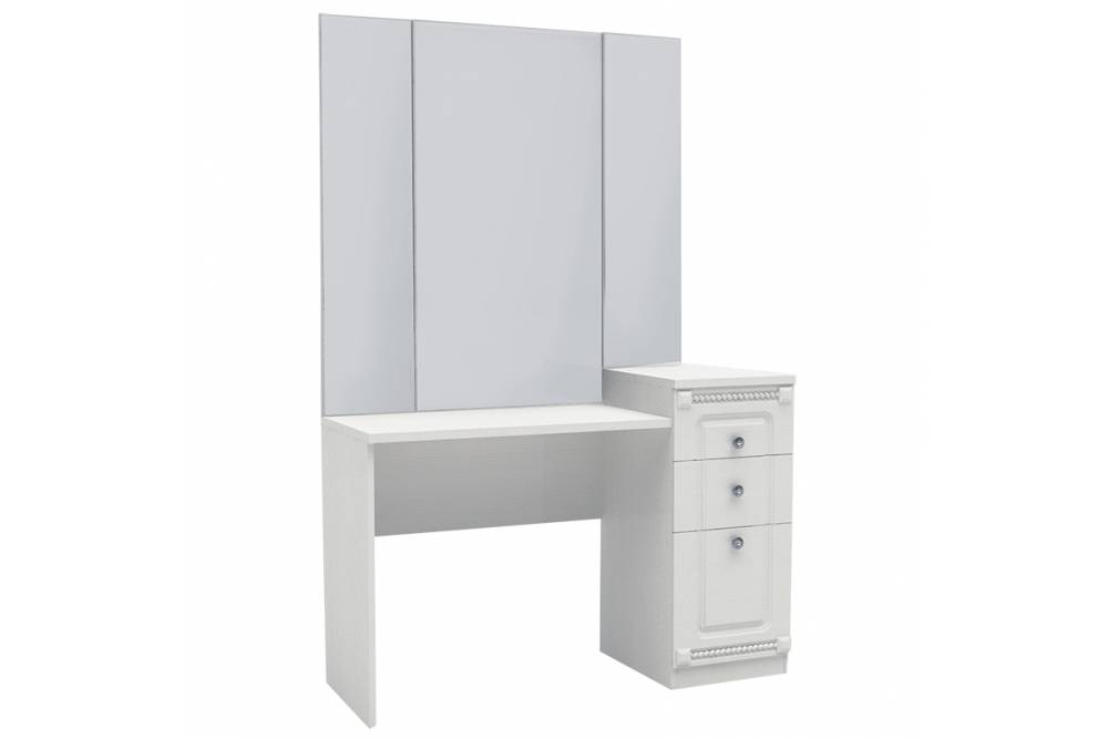 Это стол с зеркалом с 3-мя створками. Центральный отсек не двигается, а угол размещения боковых может меняться в зависимости от потребностей хозяйки. Изделие показывает отражение владелицы одновременно из нескольких ракурсов, что необходимо при создании сложных причесок и макияжей. Недостаток модели заключается в том, что она занимает много места и подходит только для просторных комнат.