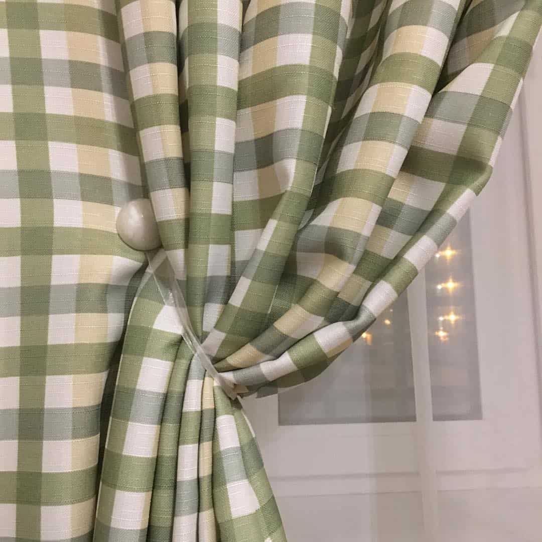 Для кухни подойдут шторы-майки в деревенском стиле. Модно, пришивать клетчатую ткань-компаньон в верхней части штор и такие же завязки.
