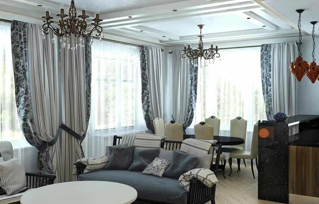 Зал, выполненный в этом стиле, требует особого подхода к декорированию окон. Хорошим вариантом считается тюль с вышивкой золотыми и серебряными нитями. По краям вешают портьеры такого же оттенка.