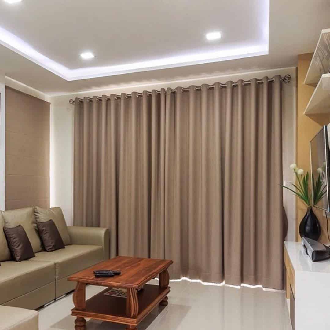 На фото бежевый однотонный тюль, который в светлом оттенке подходит под интерьер без ярко выраженного акцента на конкретном цвете.