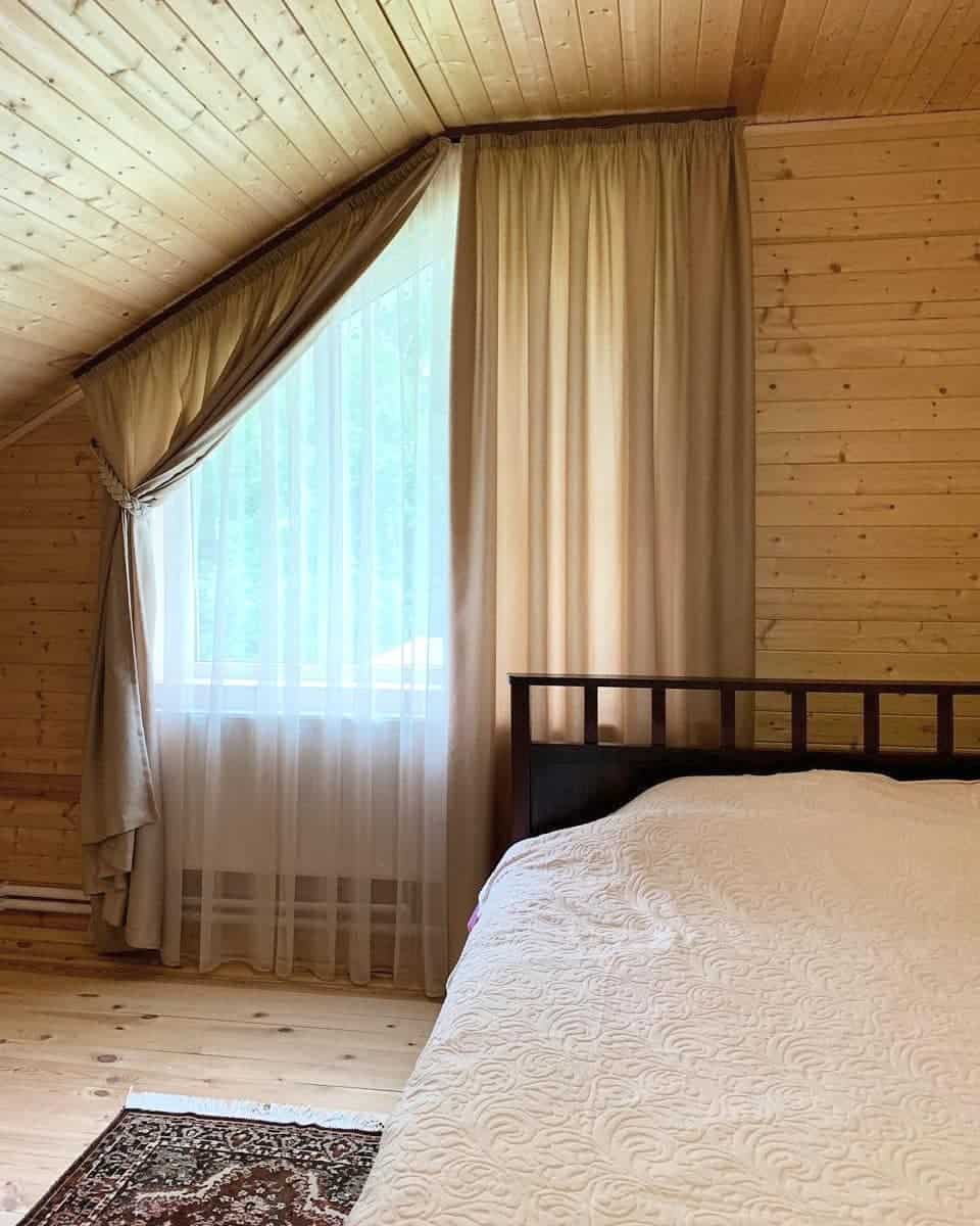 Желательно, чтобы это были натуральные тканевые материалы. Например, плотный лен для римских штор и хлопковый сетчатый тюль для гардин, или сочетание занавесок из плотного и прозрачного шелка.