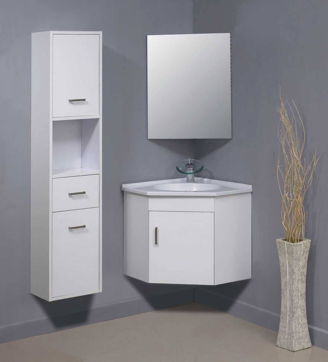 Угловые тумбы бывают навесными, напольными и в виде пенала, занимающего пространство от пола до потолка. Такие изделия стильно смотрятся в небольшой ванной комнате.
