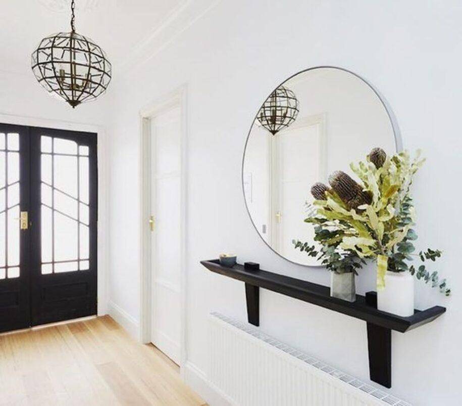 Входное помещение должно быть обустроено так, чтобы при выходе из него человек мог поглядеть на себя в зеркало и выйти на улицу в полном порядке. Для этого очень удобным вариантом считается приобретение зеркала с полкой в прихожую. Этот предмет выполняет две важные функции. Хранит вещи и создает комфортные условия для того, чтобы привести себя в порядок.