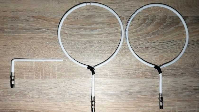 Телевизионную антенну своими руками можно сделать и из обычной металлопластиковой трубы. При этом получится устройство для приема дмв с возможным диапазоном от 480 МГц до 1000 МГц. В данной “модели” использованы труба с диаметром 16 мм и кабель – 5,5 м. На кольцо потребуется 55 см трубы, а на стойку – 14 см, что равняется четверти длины волны. Это служит для лучшего согласования с внешней оплеткой кабеля и снижает в ней высокочастотные токи.
