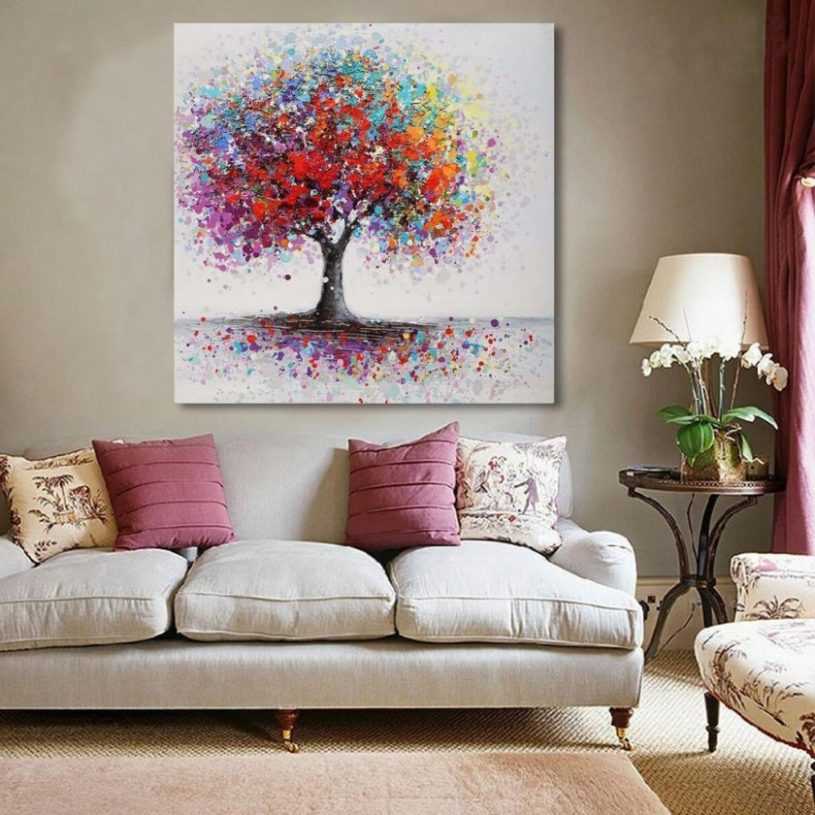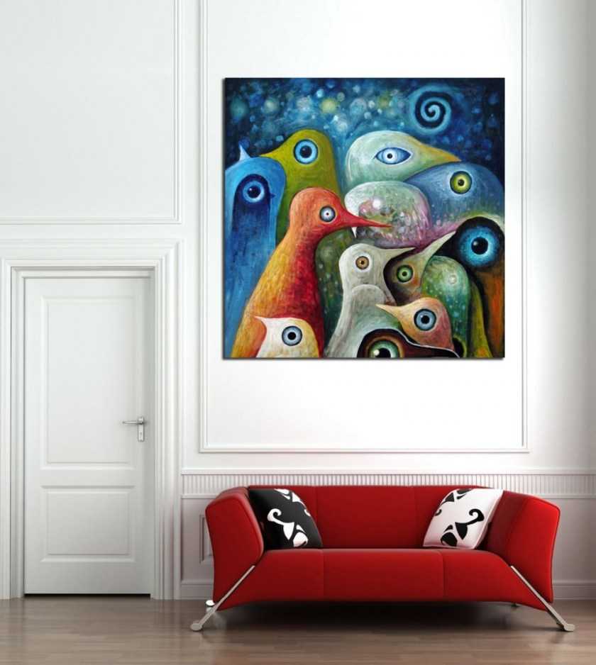 - Ответом на вопрос «какие картины повесить над диваном?» может стать использование произведений, выполненных акриловой краской. Они выгодно дополнят ретро-интерьеры или залы, оформленные в стиле поп-арт.