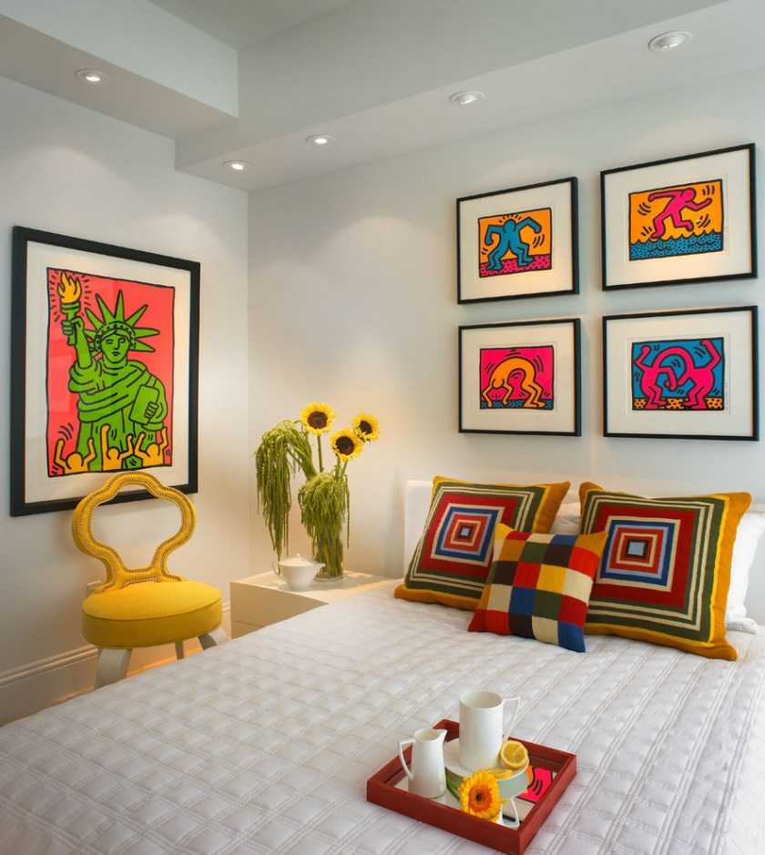 Яркие абстрактные картины могут быть применены и в китче, и баухаузе. Главное – не перегружать пространство акцентными элементами.