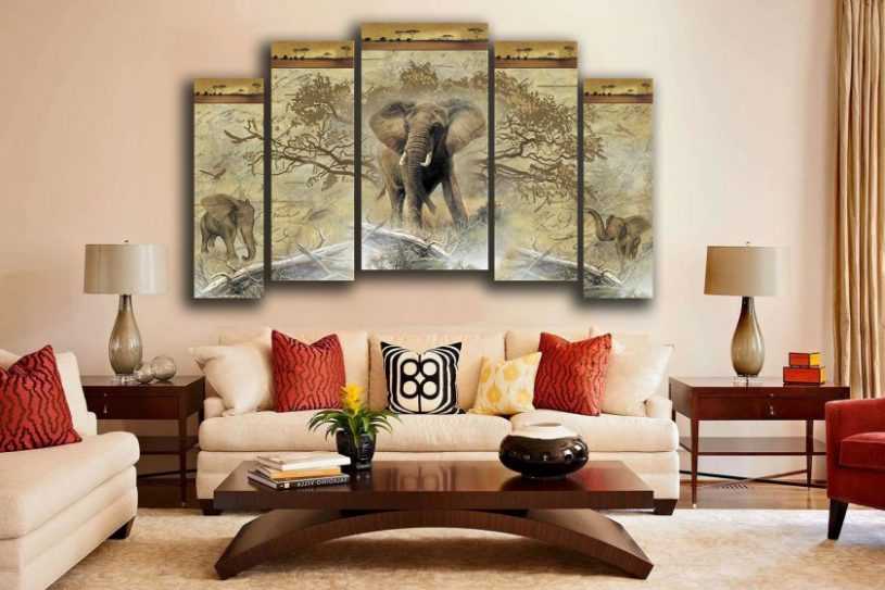 Фото картин для интерьера в африканском стиле всегда выглядят потрясающе. Обычно для них выбираются красно-оранжевые оттенки для передачи ощущения зноя и палящего солнца. На изображениях присутствуют животные, населяющие красный континент. Чаще всего изображаются жирафы, львы и гепарды.