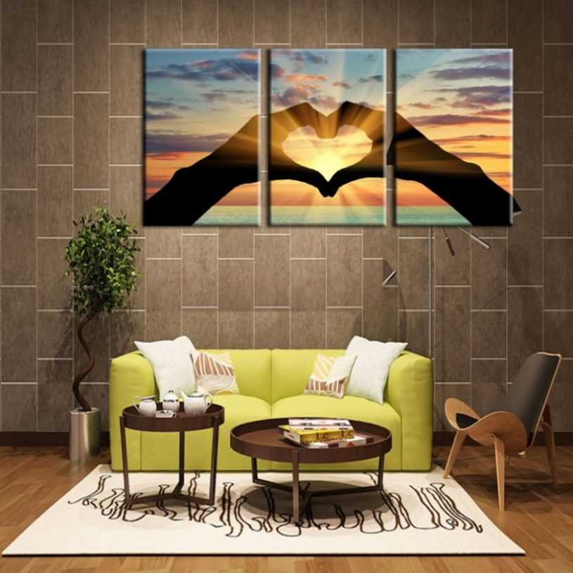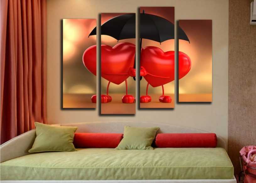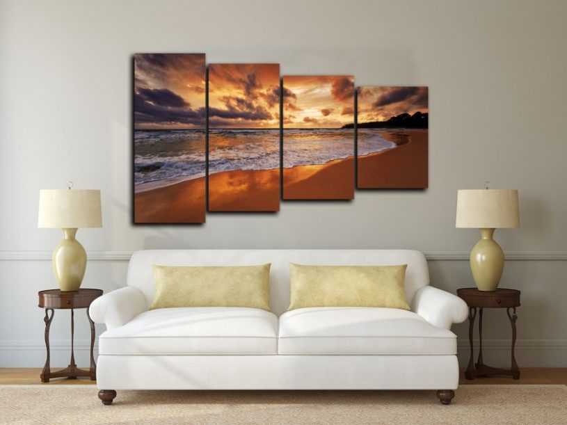 В оформлении интерьера гостиной часто используют модульные картины. Единое изображение разделяют на несколько полотен (от двух до шести), при этом полотна могут быть разных размеров или форм. Также, можно украсить большую по площади комнату с помощью нескольких маленьких картин.