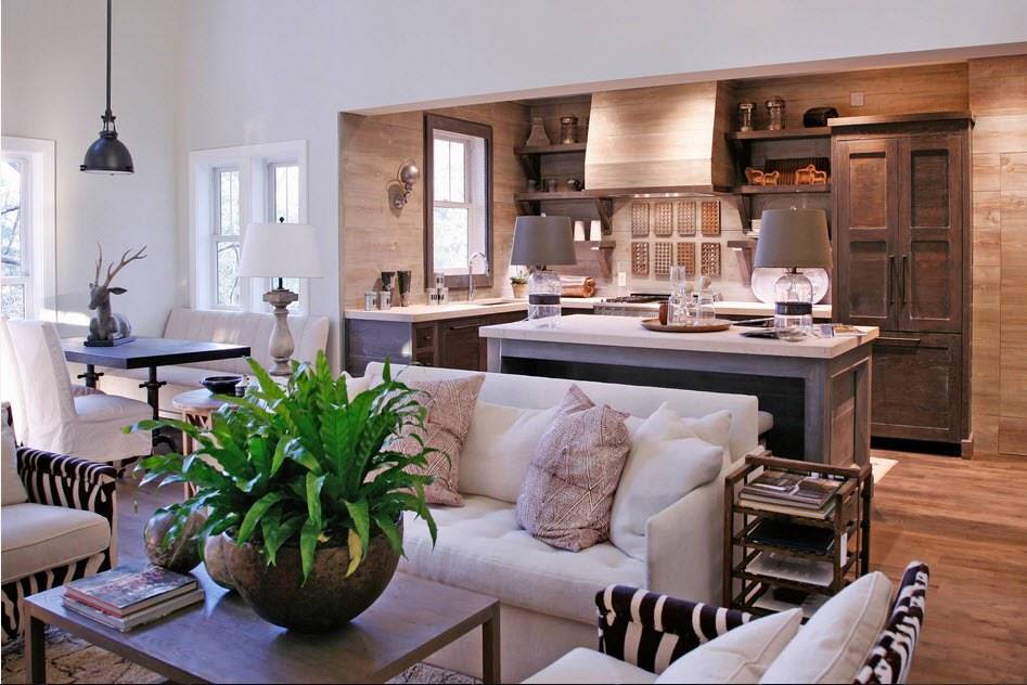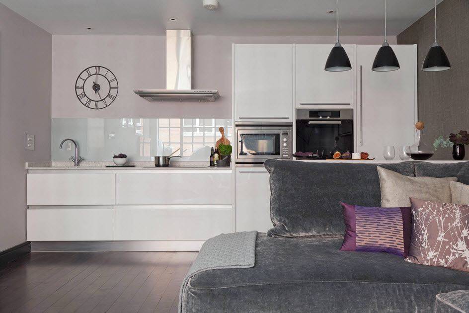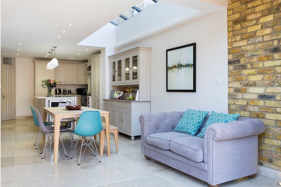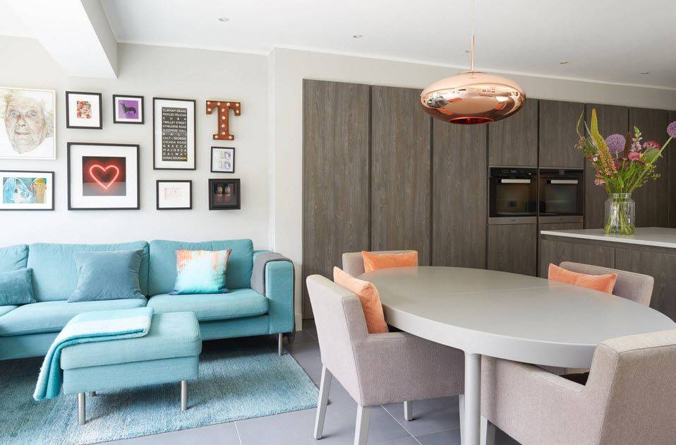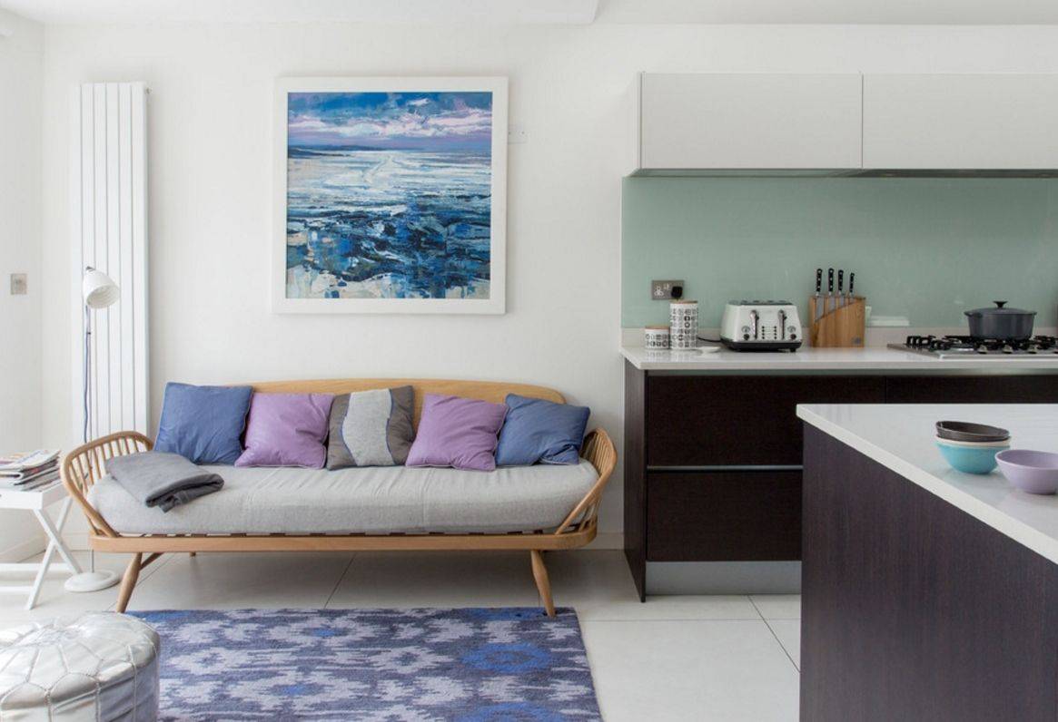 - Зачастую разделение единого пространства на зоны происходит именно с помощью дивана. Это позволяет отграничить зону приготовления еды от зоны отдыха.